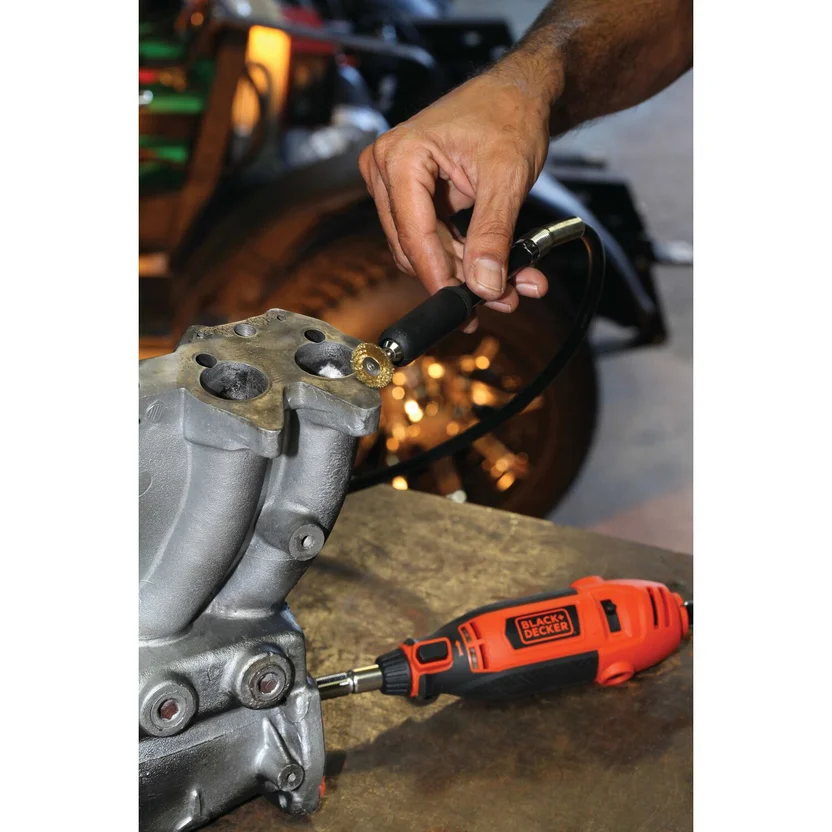 MotoTool Black+Decker RT18KA-B3 de 180W Incluye 110 accesorios, los cuales ofrecen soluciones para cortar, afilar, pulir, grabar y limpiar. También incorpora una guaya flexible, ideal para trabajos detallados que requieren movimientos suaves y controlados. Como resultado, el usuario puede lograr terminaciones más profesionales.