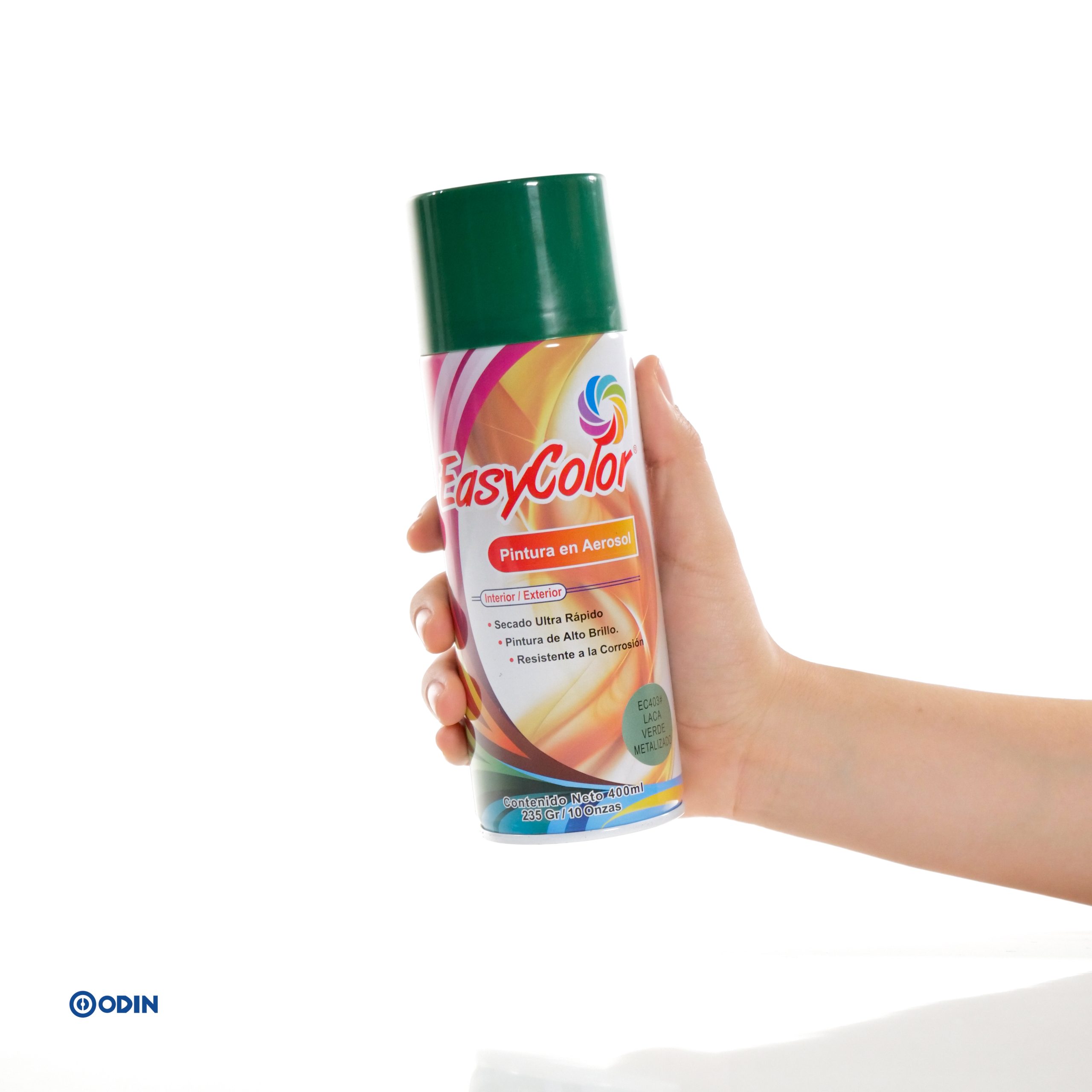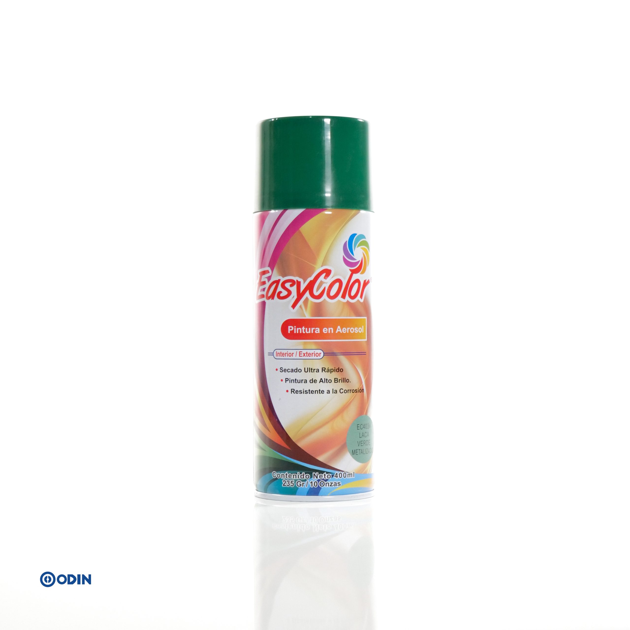 Pintura en aerosol EasyColor Verde Metalizado EC403 para interior y exterior. De alto brillo, secado ultra rápido y resistente a la corrosión. Ideal para metal, madera y cerámica.